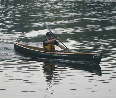 RapidFire is David Yost’s transformation of the Adirondack pack canoe into a wicked fast tripper that runs with sea kayaks. Asymmetrical hull shape, shear and rocker, and shouldered tumblehome with an elliptical bottom make RapidFire one of the more sophisticated hulls afloat. The shouldered tumblehome allows more efficient, more vertical, double paddle strokes. That, combined with the wildly efficient (beyond racing spec) 7.5 Length to Width ratio, RapidFire flies like a scram-jet and tracks like a train.