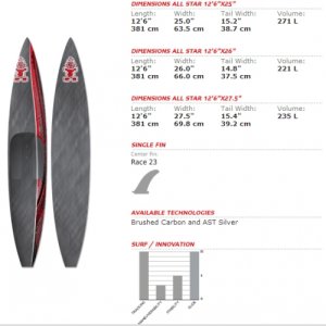 The All Star is an all-rounder with highly diverse characteristics. Fast in chop, great for beach-start racing, fantastic for downwinders, yet competitive in flat water. The middle and upper part of the rails are raised and box-shaped around the standing area, providing added volume / stability. A medium-round bow penetrates upwind, and provides a slippery ride through and over waves downwind. Just sufficient nose volume makes the nose shoot through waves and pop up again with minimal friction. The flattened-out nose section rocker maximizes the waterline and increases the speed. Its sharp edge at the tucked under mid-section increases the release for surf. The tail section with extra volume lifts the board up for early surfing in bumps and makes it especially easy to turn around buoys. The All Stars are narrow, fast hulls with surprisingly good stability, enabling you to keep your paddle closer to the center-line of the board. A state-of-the-art full sandwich PVC, UD carbon technology is extra-stiff, light and super-durable.