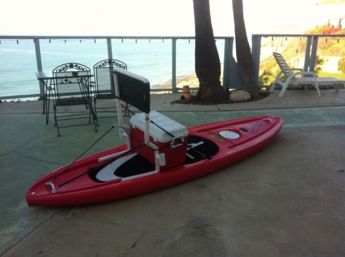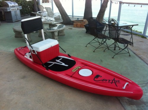 This system is fairly lightweight, and attaches to the board in seconds with bungee straps. It works with industry standard coolers such as the one shown, and is comfortable to use and effective. The (prototype shown) structure will be made from aluminum, and has a backrest to lean back against so you can paddle seated using a standard Stand Up Paddle. A rod holder on each side is integrated into the system for trolling, and the cooler is accessible at all times so you can get at everything from your tackle, to beverages and of course, store your catch. The board itself has a front hatch so additional storage space is available inside the board.