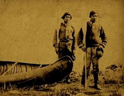 A very old image posted on Facebook showcases two Mi'kmaq men next to their bark canoe. Difficult with the tones in the background but you can just make out the shape of the long paddle blades.