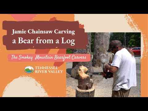 Jamie withThe Smokey Mountain Bearfoot Carvers carving a bear from a log in...